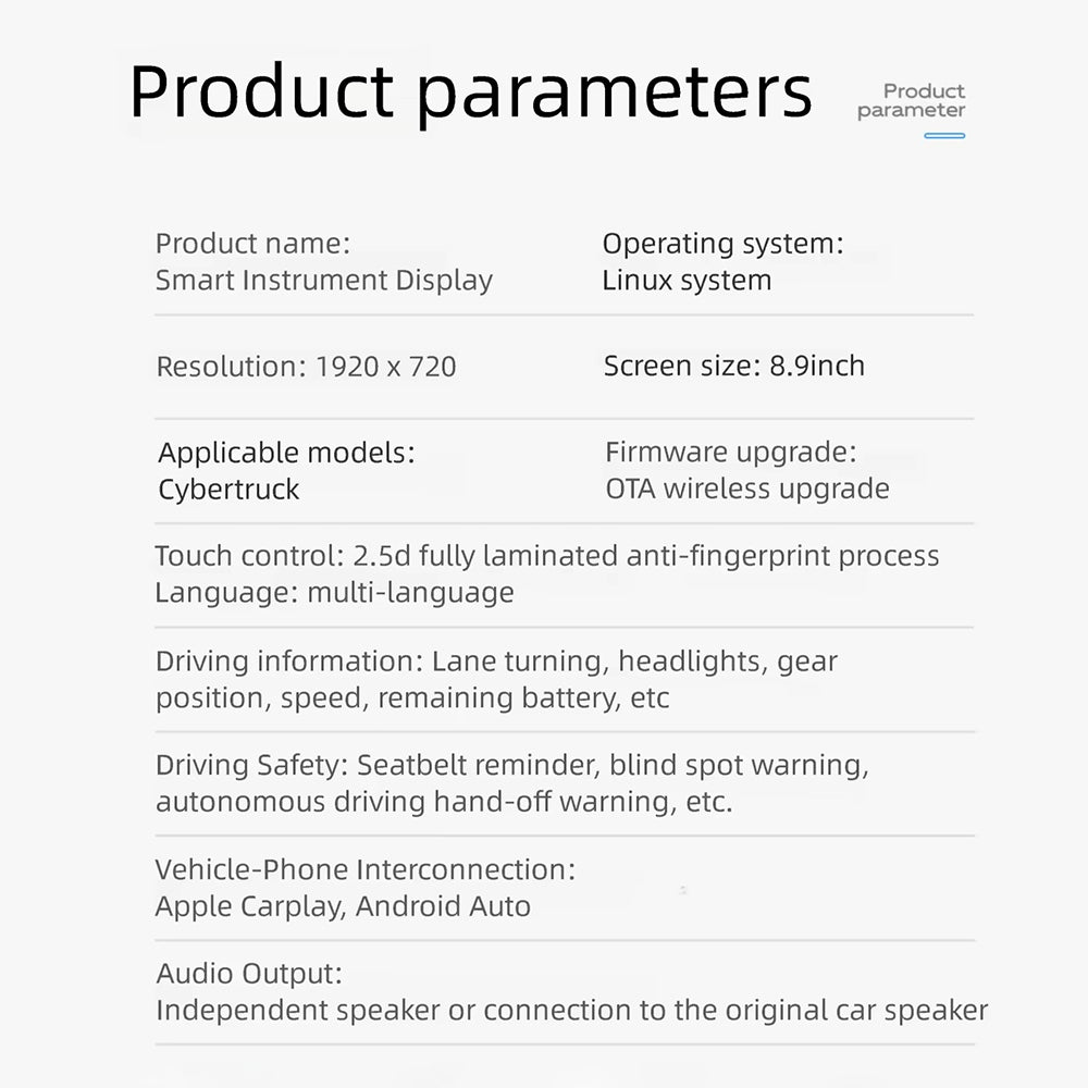 8.9" Smart Instrument Cluster for Tesla Cybertruck | HD Dash Display, Wireless CarPlay & Real-Time Data